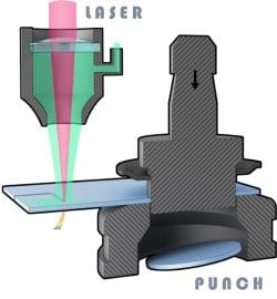 Punch Press use tools called punch and dies, which punches holes and shapes to make any number of patterns. Particularly effective for cutting simple patterns that are more economical than cutting on a laser cutter or a water jet. Punch presses can operate at hundreds of strokes per minute making this a suitable center for processing parts quickly.